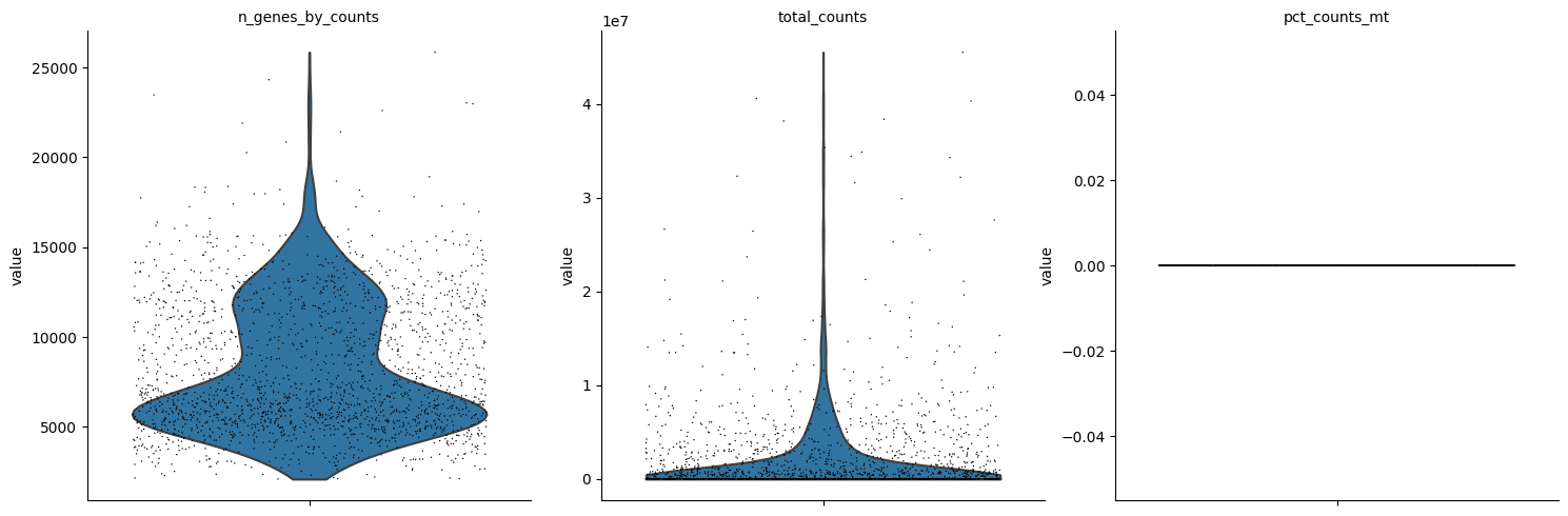 # adata = adata[adata.obs.pct_counts_mt < 30]sc.pl.violin(adata, ['n_genes_by_counts', 'total_counts', 'pct_counts_mt'], jitter=0.4, multi_panel=True)