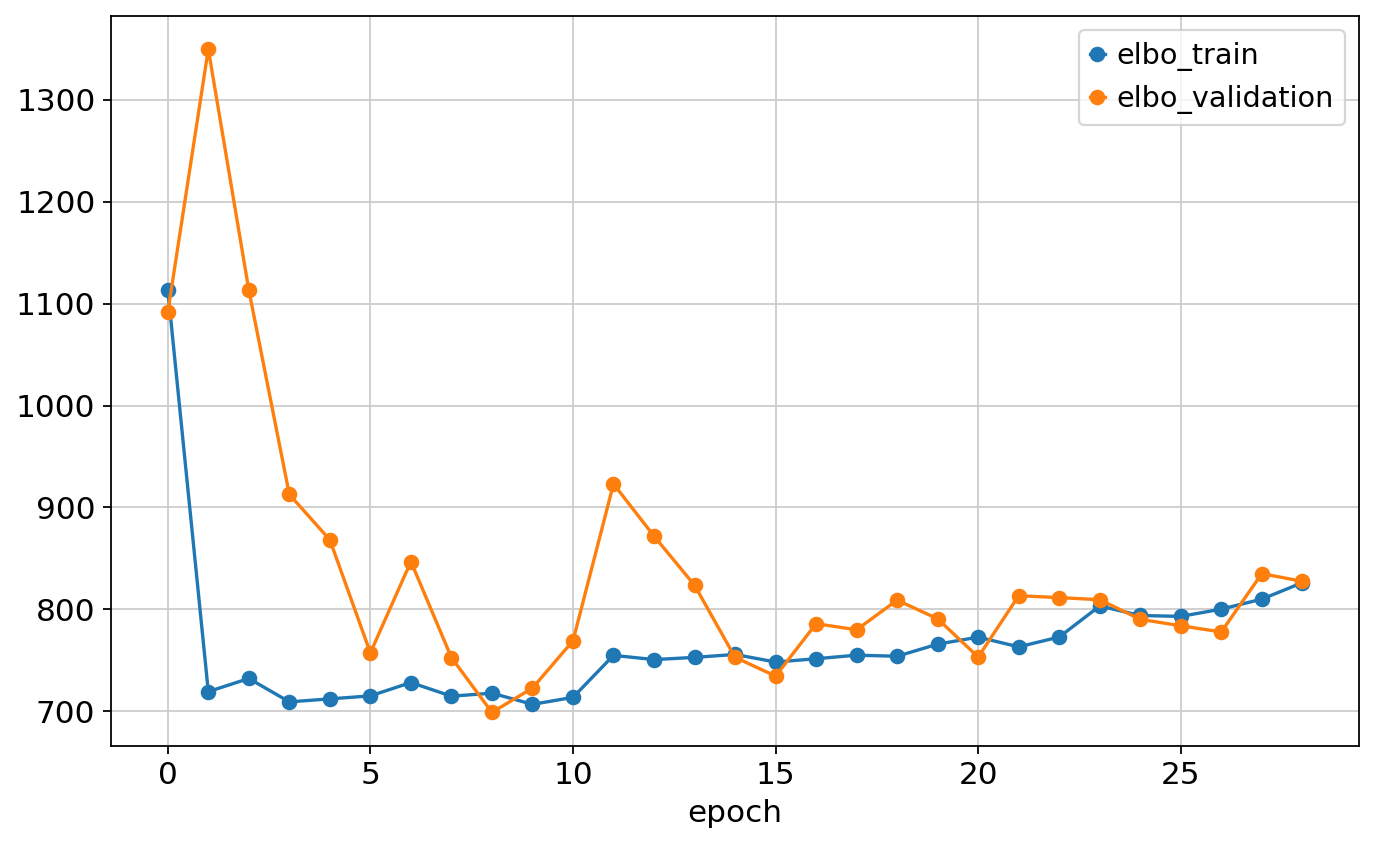 Monitored metric elbo_validation did not improve in the last 20 records. Best score: 698.829. Signaling Trainer to stop.