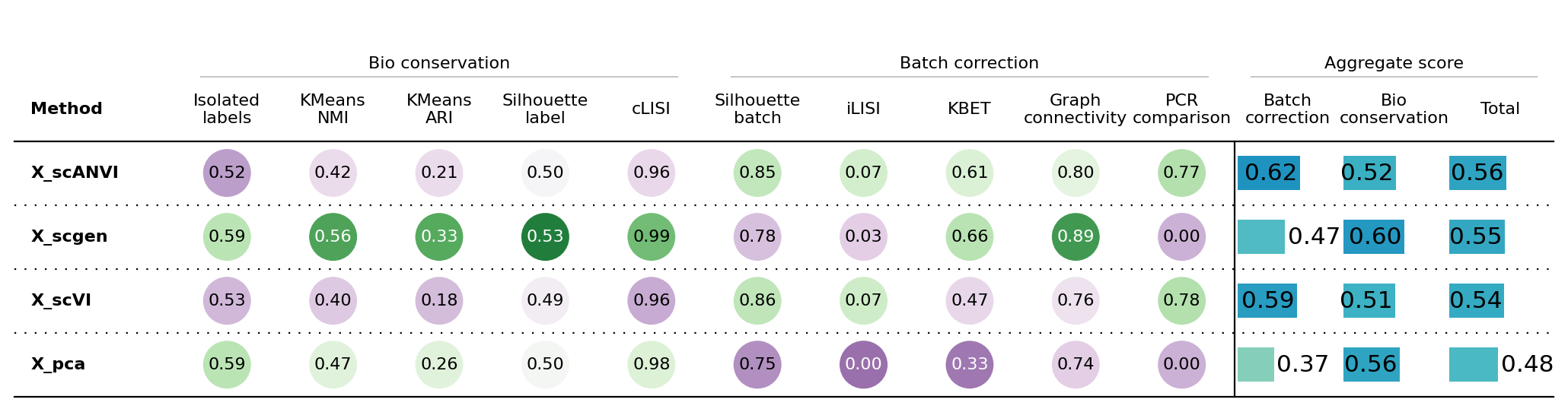 bm.plot_results_table(min_max_scale=False, save_dir='../results/02_human_integration/')Computing neighbors: 0%| | 0/4 [00:00<?, ?it/s]/home/fdb589/projects/data/Brickman/conda/envs/scvi-1.0.0/lib/python3.10/site-packages/umap/distances.py:1063: NumbaDeprecationWarning: The 'nopython' keyword argument was not supplied to the 'numba.jit' decorator. The implicit default value for this argument is currently False, but it will be changed to True in Numba 0.59.0. See https://numba.readthedocs.io/en/stable/reference/deprecation.html#deprecation-of-object-mode-fall-back-behaviour-when-using-jit for details.