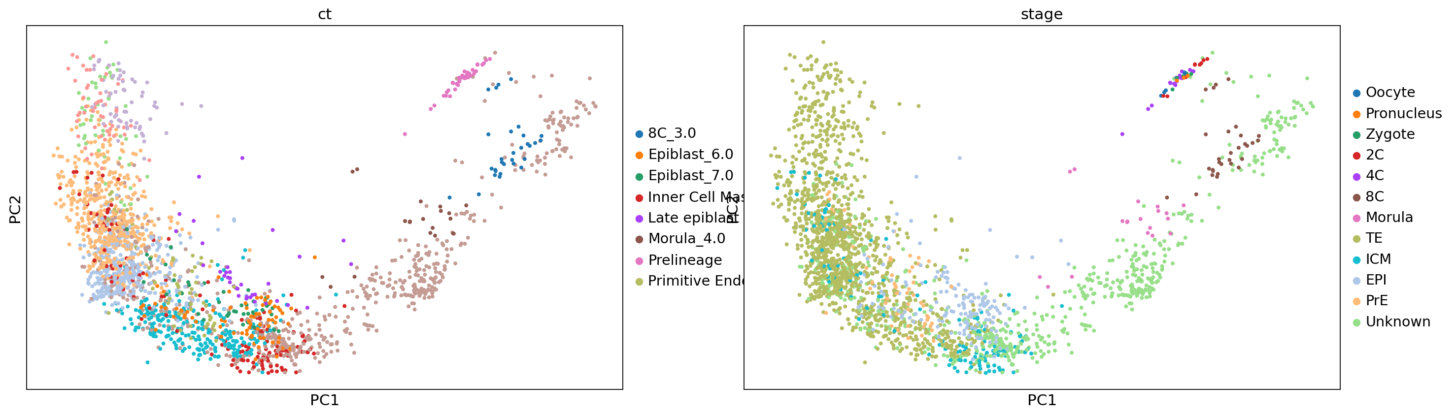 sc.pl.pca(adata, color=['ct', 'stage'])