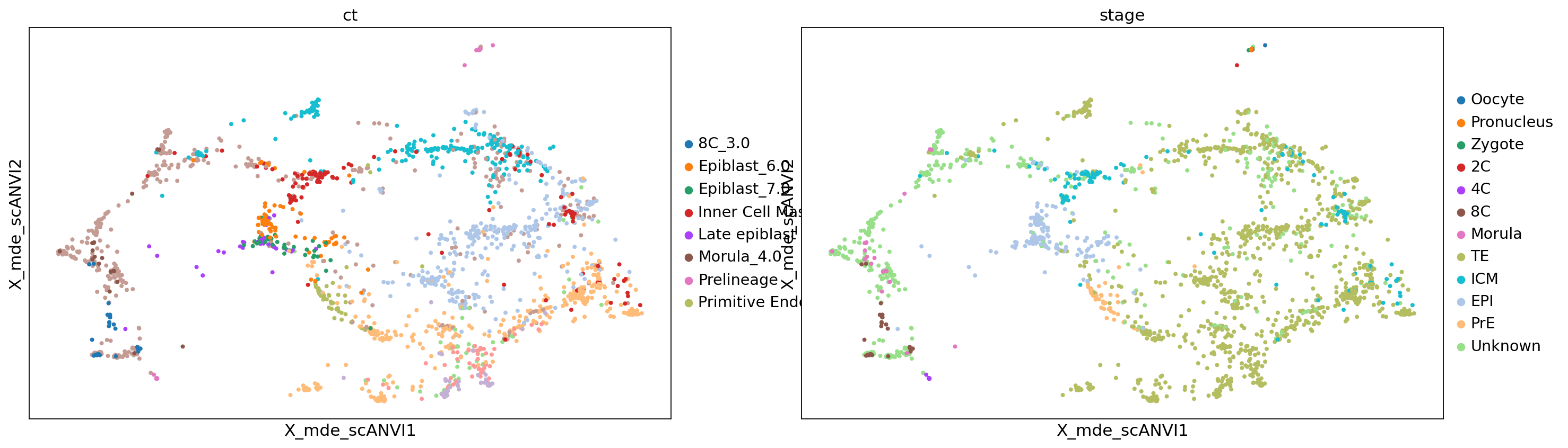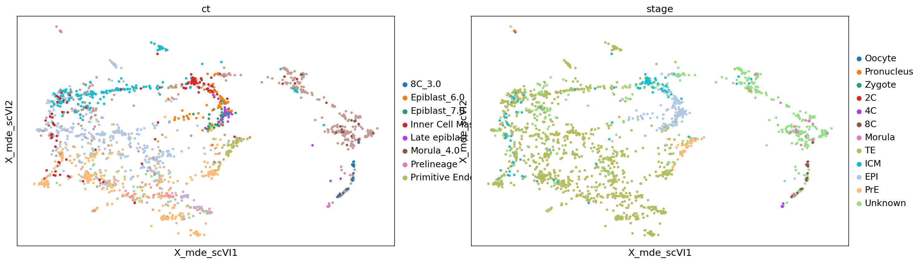 sc.pl.embedding(adata, color=['ct', 'stage'], basis='X_mde_scVI')