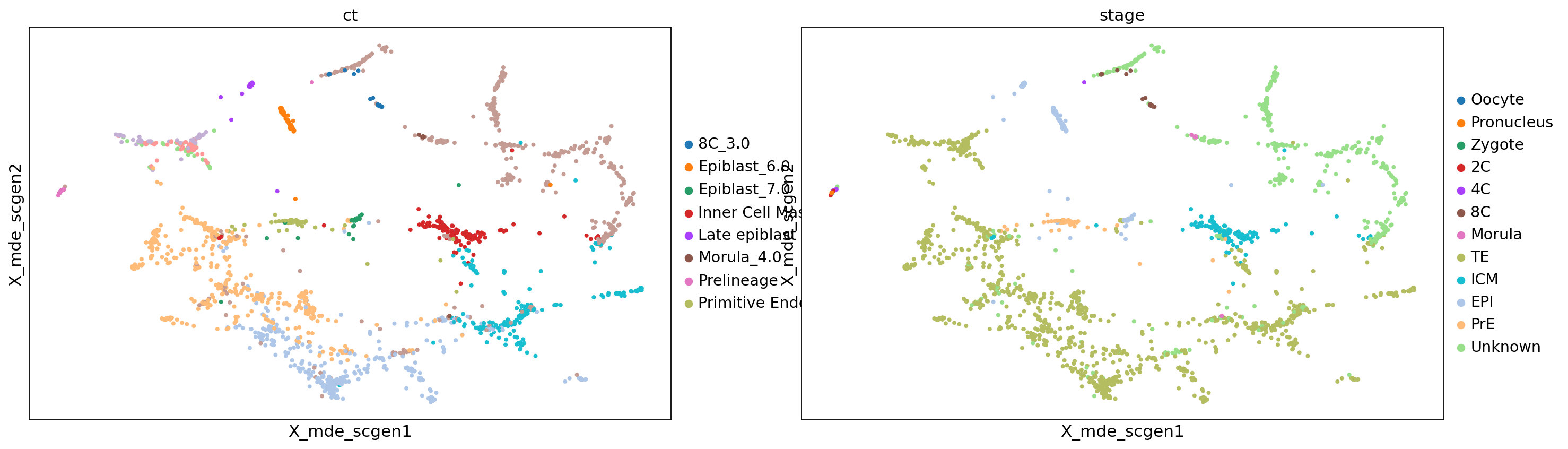 sc.pl.embedding(adata, color=['ct', 'stage'], basis='X_mde_scgen')