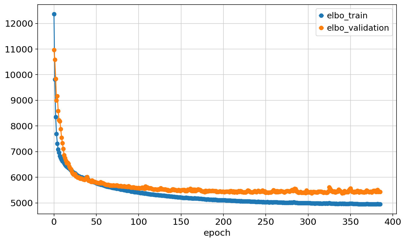 Monitored metric elbo_validation did not improve in the last 45 records. Best score: 5377.381. Signaling Trainer to stop.