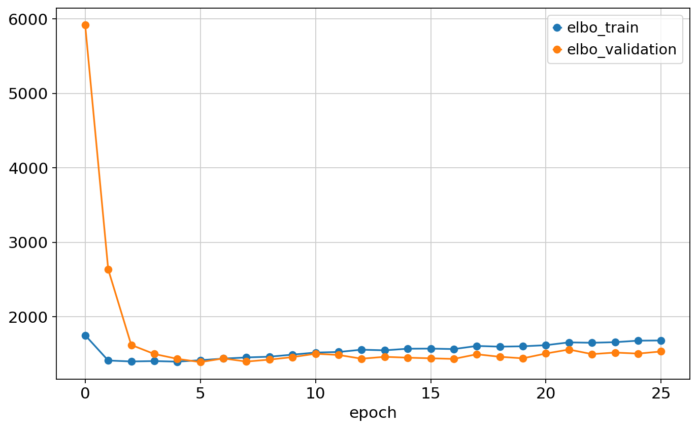 pd.concat([mscgen.history['elbo_train'], mscgen.history['elbo_validation']], axis=1).plot.line(marker='o')<Axes: xlabel='epoch'>