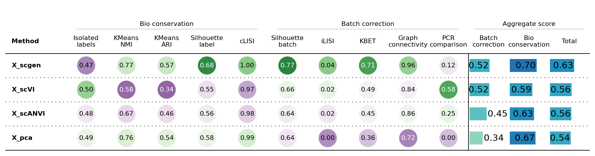 bm.plot_results_table(min_max_scale=False, save_dir='../results/02_mouse_integration/')Computing neighbors: 0%| | 0/4 [00:00<?, ?it/s]/home/fdb589/projects/data/Brickman/conda/envs/scvi-1.0.0/lib/python3.10/site-packages/umap/distances.py:1063: NumbaDeprecationWarning: The 'nopython' keyword argument was not supplied to the 'numba.jit' decorator. The implicit default value for this argument is currently False, but it will be changed to True in Numba 0.59.0. See https://numba.readthedocs.io/en/stable/reference/deprecation.html#deprecation-of-object-mode-fall-back-behaviour-when-using-jit for details.