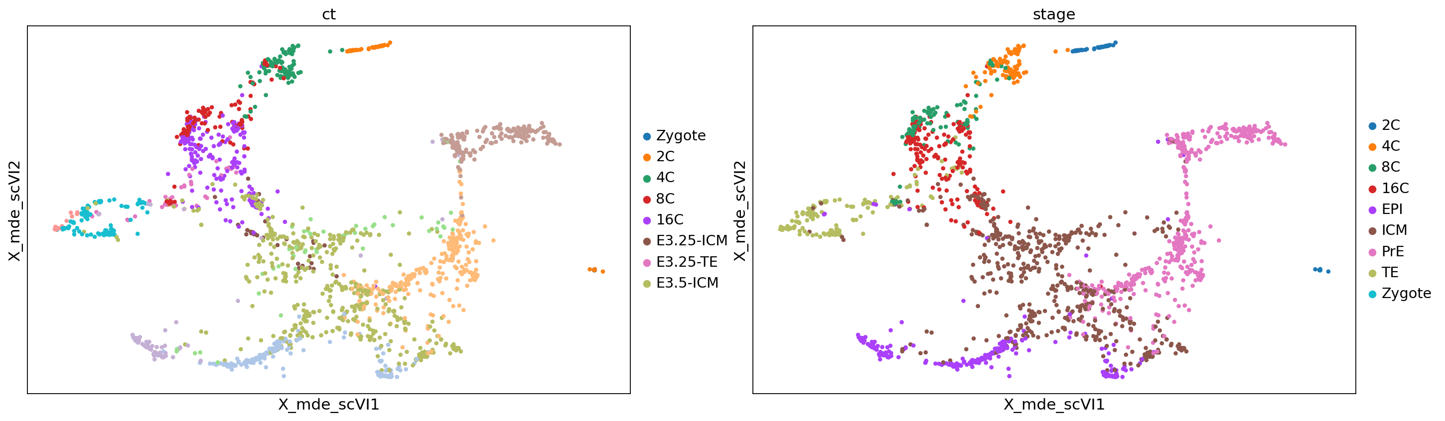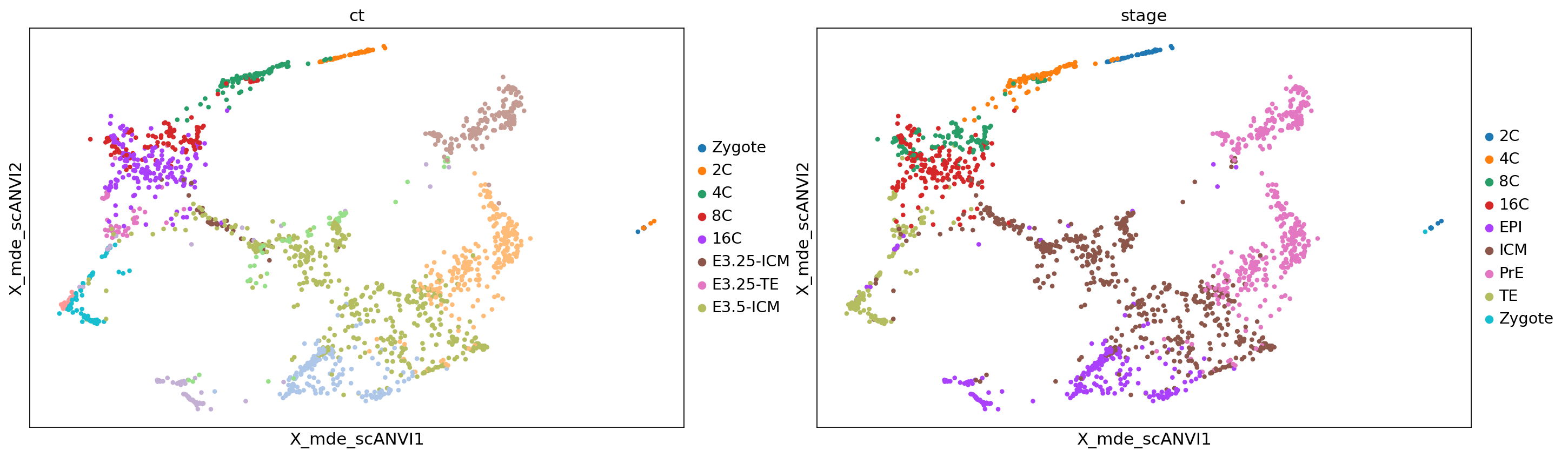 sc.pl.embedding(adata, color=['ct', 'stage'], basis='X_mde_scVI')