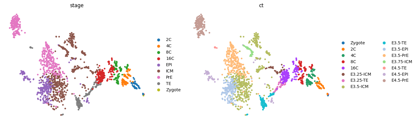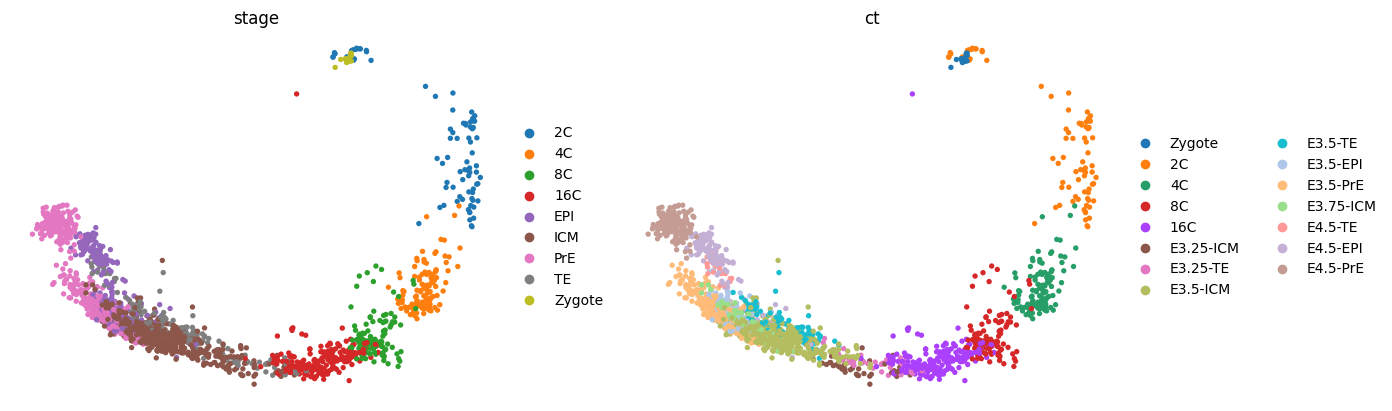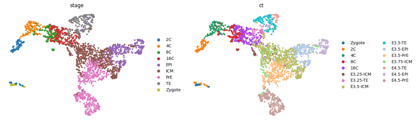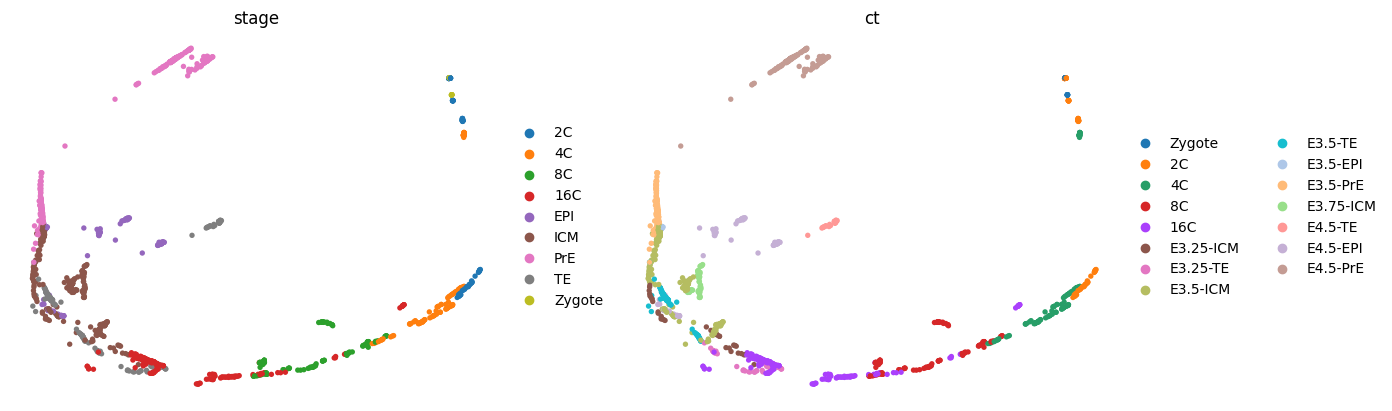 sc.tl.draw_graph(corrected_adata)sc.pl.draw_graph(corrected_adata, color=['ct', 'Stage'], wspace=0.4, frameon=False)sc.tl.umap(corrected_adata)