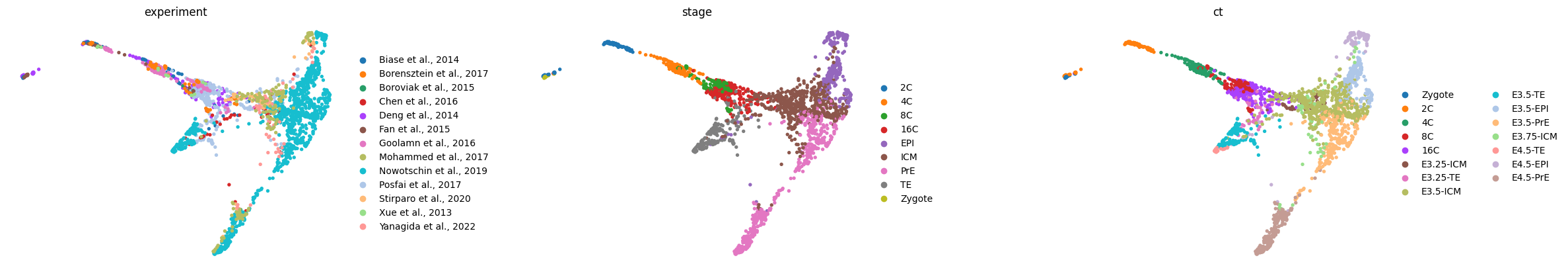 sc.pl.draw_graph(adata, color=['experiment', 'stage', 'ct'], frameon=False, ncols=3, wspace=0.4)