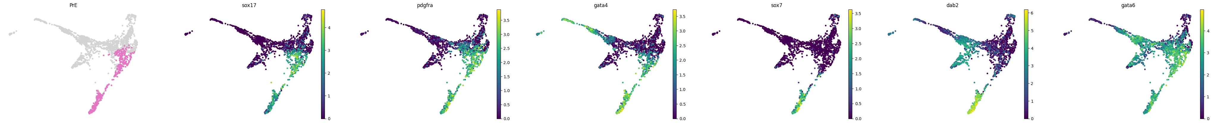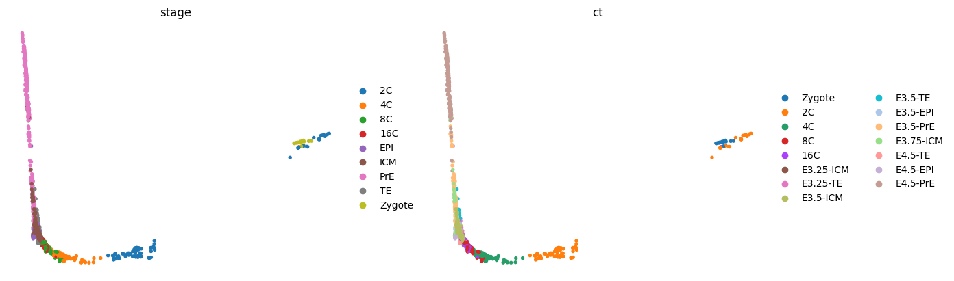 # sc.pl.embedding(adata, basis='X_palantir_multiscale', color=['ct', 'stage'], frameon=False, ncols=2)def filter_markers(df: pd.DataFrame, n_genes: int = 5, upper: bool = False):