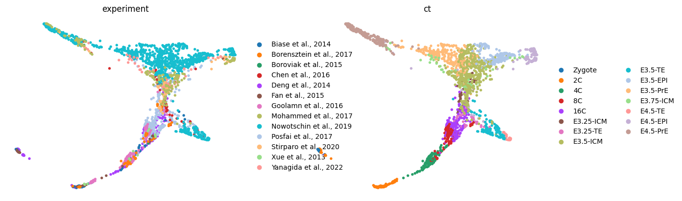 sc.pl.draw_graph(adata, color=['experiment', 'ct'], frameon=False, ncols=2, cmap='tab20')