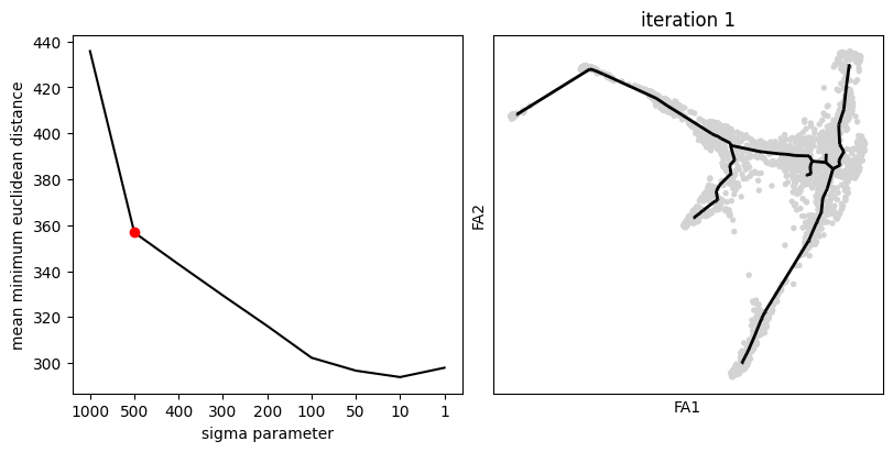 scf.tl.pseudotime(adata,n_jobs=10,n_map=10,seed=42)projecting cells onto the principal graph
