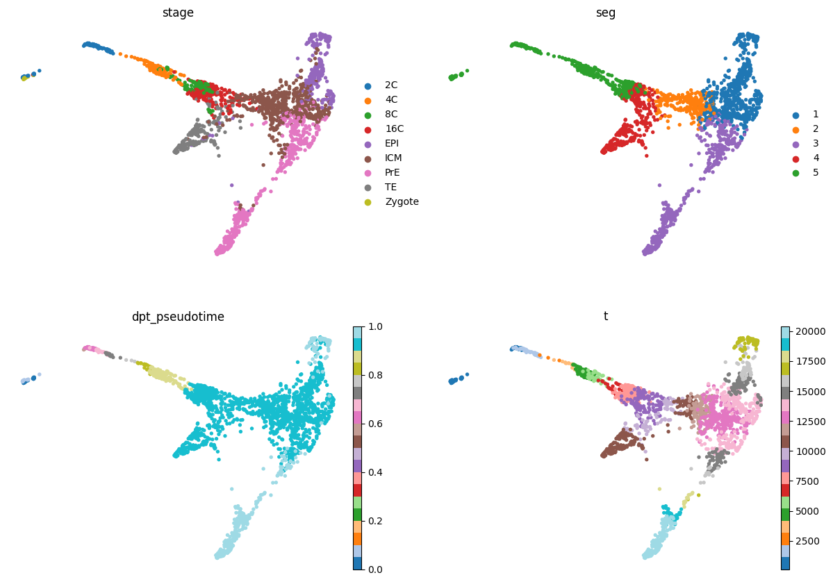 sc.pl.draw_graph(adata, color=['stage', 'seg', 'dpt_pseudotime', 't'], frameon=False, ncols=2, cmap='tab20')