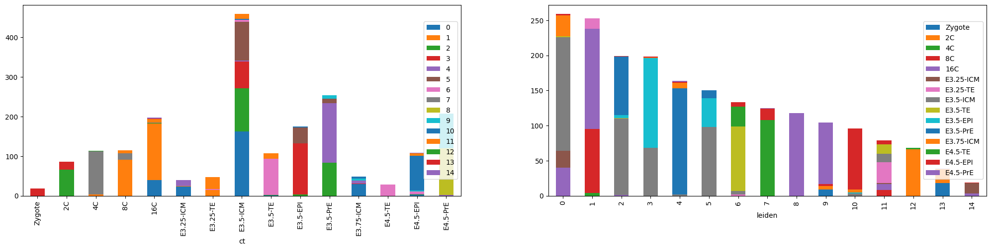 adata.obs.groupby(['leiden', 'ct']).size().unstack().plot(kind='bar', stacked=True, ax=ax[1]).legend(loc='right')<matplotlib.legend.Legend at 0x7f1a6a933fa0>