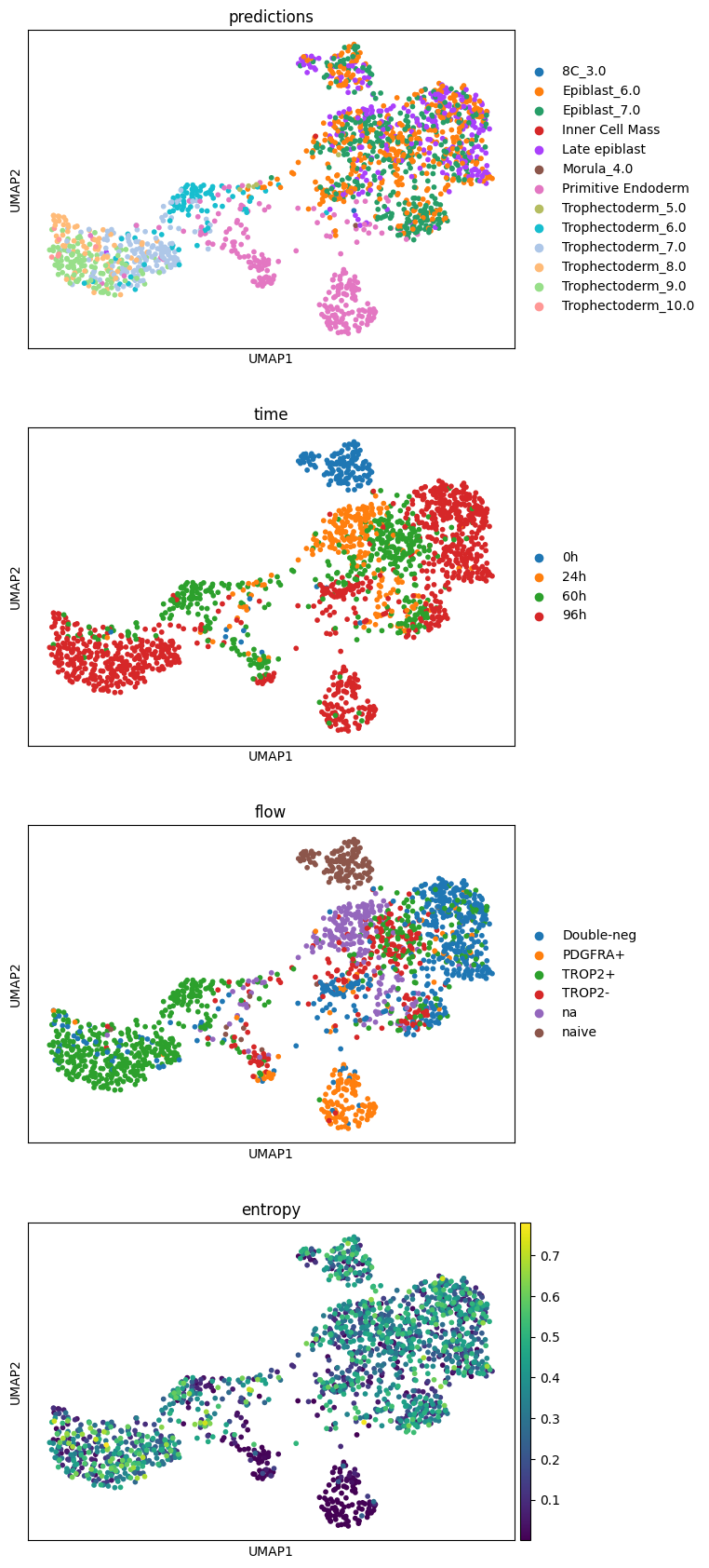 sc.pl.umap(query, color= ['predictions' ,'time' , 'flow' , 'entropy' ], ncols= 1 )