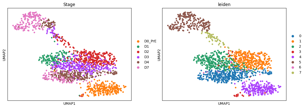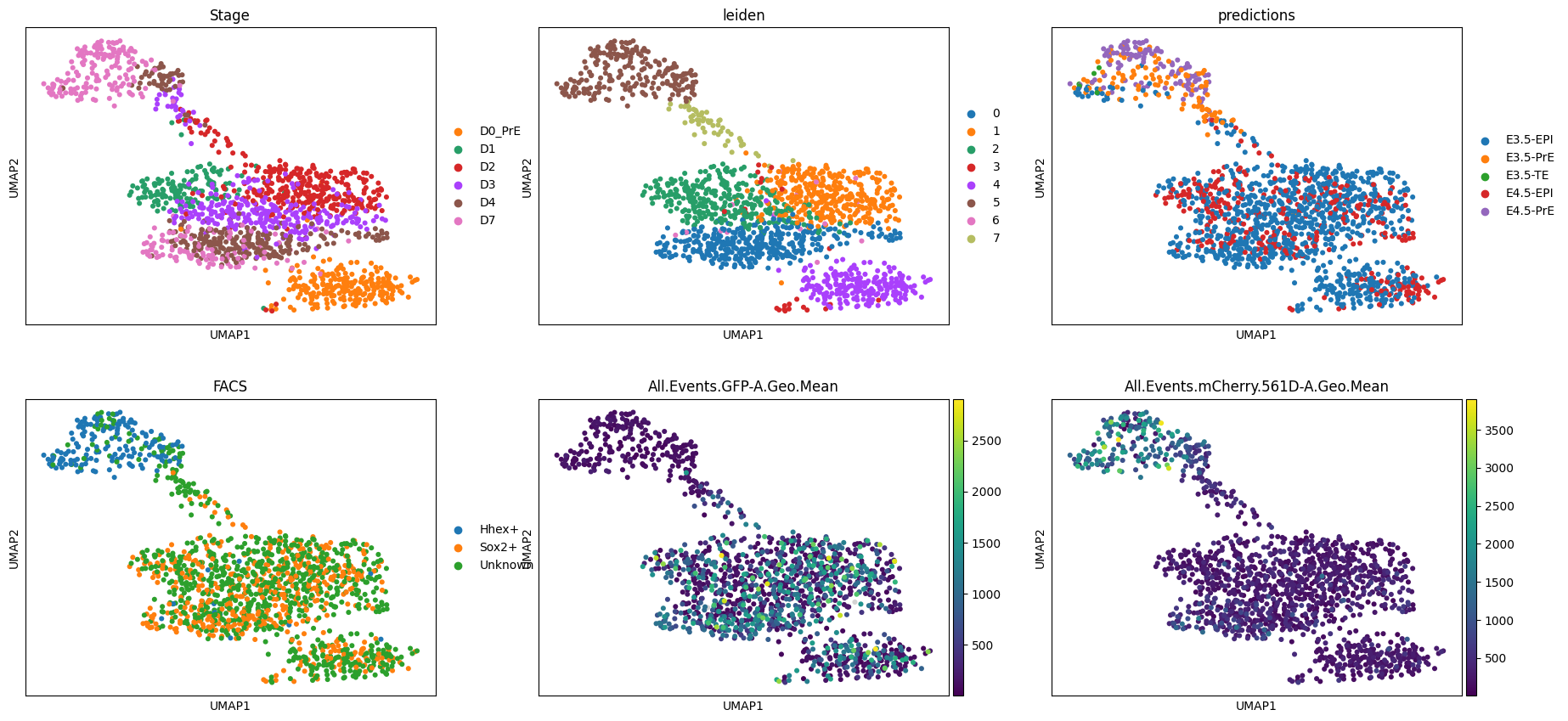 obs: 'Well_coordinates', 'plate_ID', 'Amp_batch_ID', 'Cell_barcode', 'Pool_barcode', 'Batch', 'Condition', 'SampleName', 'Stage', 'Source', 'Day', 'Index sort', 'All.Events.FSC-A.Geo.Mean', 'All.Events.SSC-A.Geo.Mean', 'All.Events.GFP-A.Geo.Mean', 'All.Events.mCherry.561D-A.Geo.Mean', 'All.Events.DAPI-A.Geo.Mean', 'n_genes_by_counts', 'total_counts', 'total_counts_mt', 'pct_counts_mt', 'total_counts_ercc', 'pct_counts_ercc', 'total_counts_ribo', 'pct_counts_ribo', 'n_genes', 'n_counts', 'S_score', 'G2M_score', 'phase', 'louvain', 'leiden', 'umap_density_Stage', 'batch', 'initial_size_spliced', 'initial_size_unspliced', 'initial_size', 'velocity_self_transition', 'root_cells', 'end_points', 'velocity_pseudotime', 'latent_time', 'velocity_length', 'velocity_confidence', 'velocity_confidence_transition'