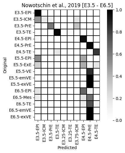 query.obs['orig'] = query.obs[['Timepoint', 'CellType']].agg('-'.join, axis=1)_ = sns.heatmap(sc.metrics.confusion_matrix('orig', 'predictions', data=query.obs), cmap='Greys', square=True, linewidth=0.2, linecolor='black').set(ylabel='Original', xlabel='Predicted', title='Nowotschin et al., 2019 [E3.5 - E6.5]')
