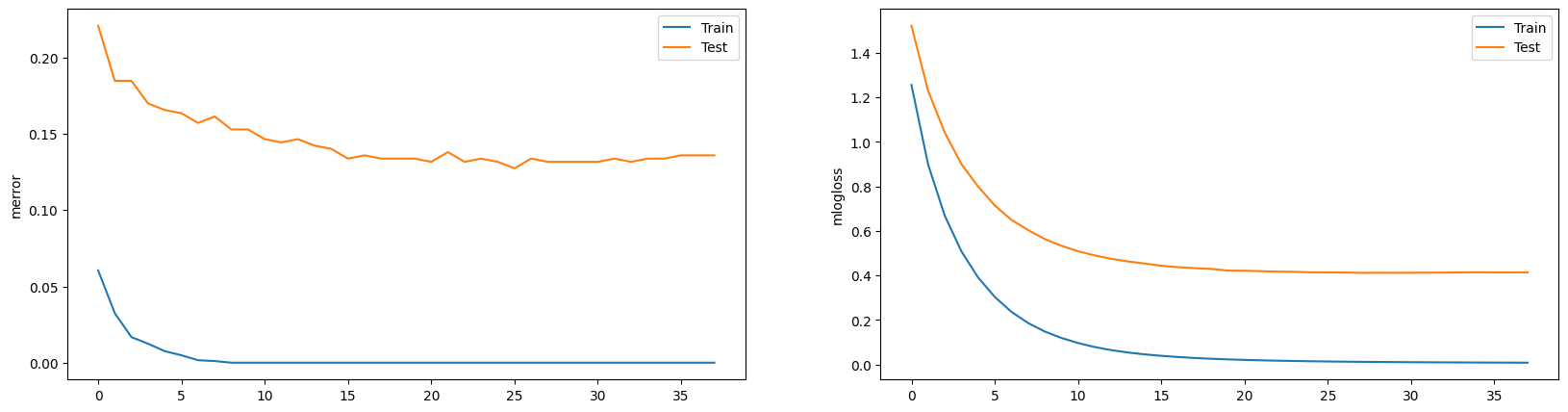 [37] validation_0-merror:0.00000 validation_0-mlogloss:0.00760 validation_1-merror:0.13588 validation_1-mlogloss:0.41341